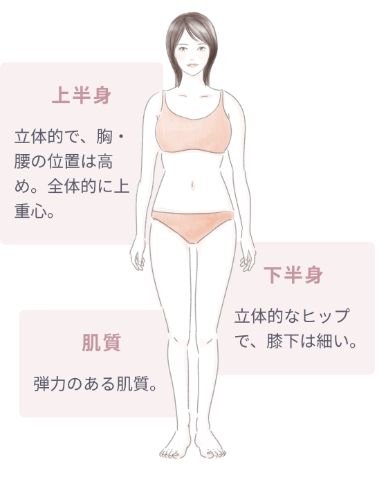 身体に厚みのある欧米人型の立体的メリハリボディ。首から肩への距離が短く、胸の位置は高め。肋骨と腰骨の距離も短く、腰位置が高く、全体的に重心が上にあります。
