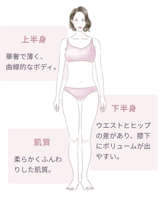 肋骨と腰骨の距離は長く、ウエストとヒップの差が大きめです。ヒップは平面的で、太ももよりも膝下にボリュームがでやすいです。