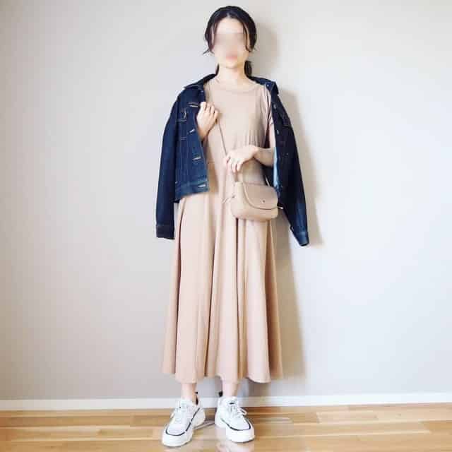 シンプルワンピースなら楽ちん可愛いスポーツ観戦コーデが叶います!スニーカーとデニムジャケットを合わせてカジュアルに、ベーシックカラーでまとめて大人っぽく。