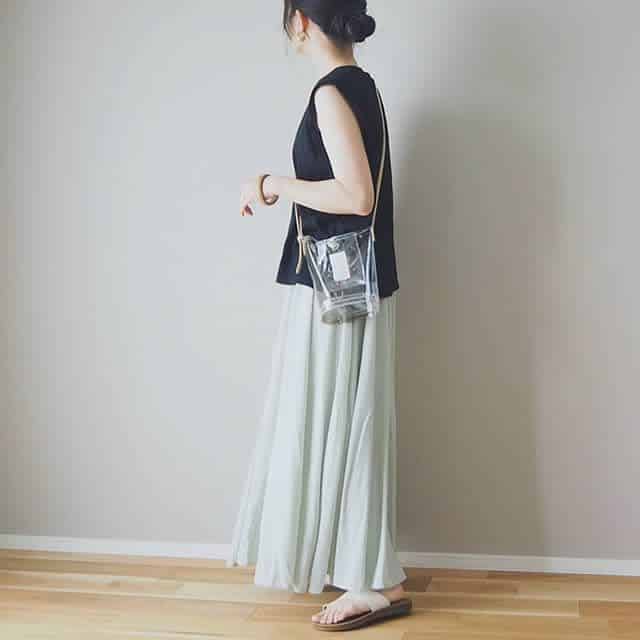 涼しげなアイテムを組み合わせた夏らしいバーベキューコーデ。淡いカラーのマキシ丈スカートには黒トップスを合わせてメリハリを。サンダルとクリアバッグなら川でのバーベキューでも思いっきり楽しめます!
