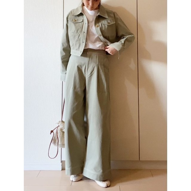 メンズライクに仕上げるなら、ミリタリージャケット×パンツのセットアップが◎!ハイウエストパンツならウエストマークでスタイルUPが叶います。