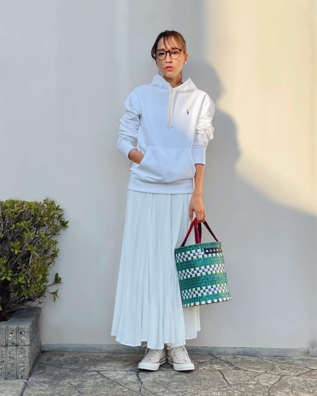 パーカー×プリーツスカートのきれいめカジュアルコーデ。オールホワイトに、グリーンのかごバッグがよく映えます!