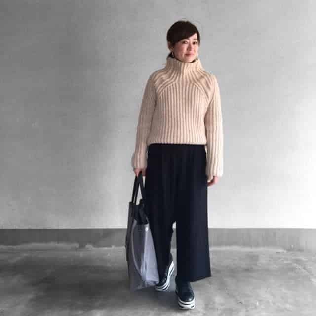 体のラインが出にくいざっくり編みニットは、60代女性にもおすすめのアイテム。首元や袖口などモードなディテールを持った一着は、シンプルコーデに映える強い味方。ボトムスは引き立て役に徹するのがバランスよく仕上がるコツです。
