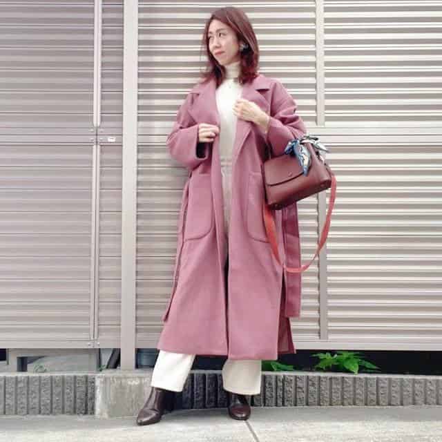 パッと目を引くピンクのワイドパンツは、コーディネートの主役!足元は、スッキリ見えを後押ししつつ引き立て役に回ってくれるダークカラーのチョイスが正解。